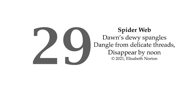 DeleteWhat an assortment--the 27th made me laugh out loud, and the 29th, with its "spangles dangle" and wonderful alliteration made me see spiderwebs anew, even though I've read many spiderweb poems. Wonderful!